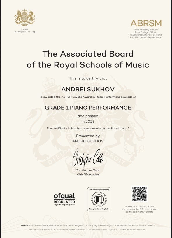 Поздравляем Сухова Андрея с успешной сдачей международного экзамена для пианистов ABRSM Grade 1 (класс преподавателя Корноуховой Софьи Михайловны).