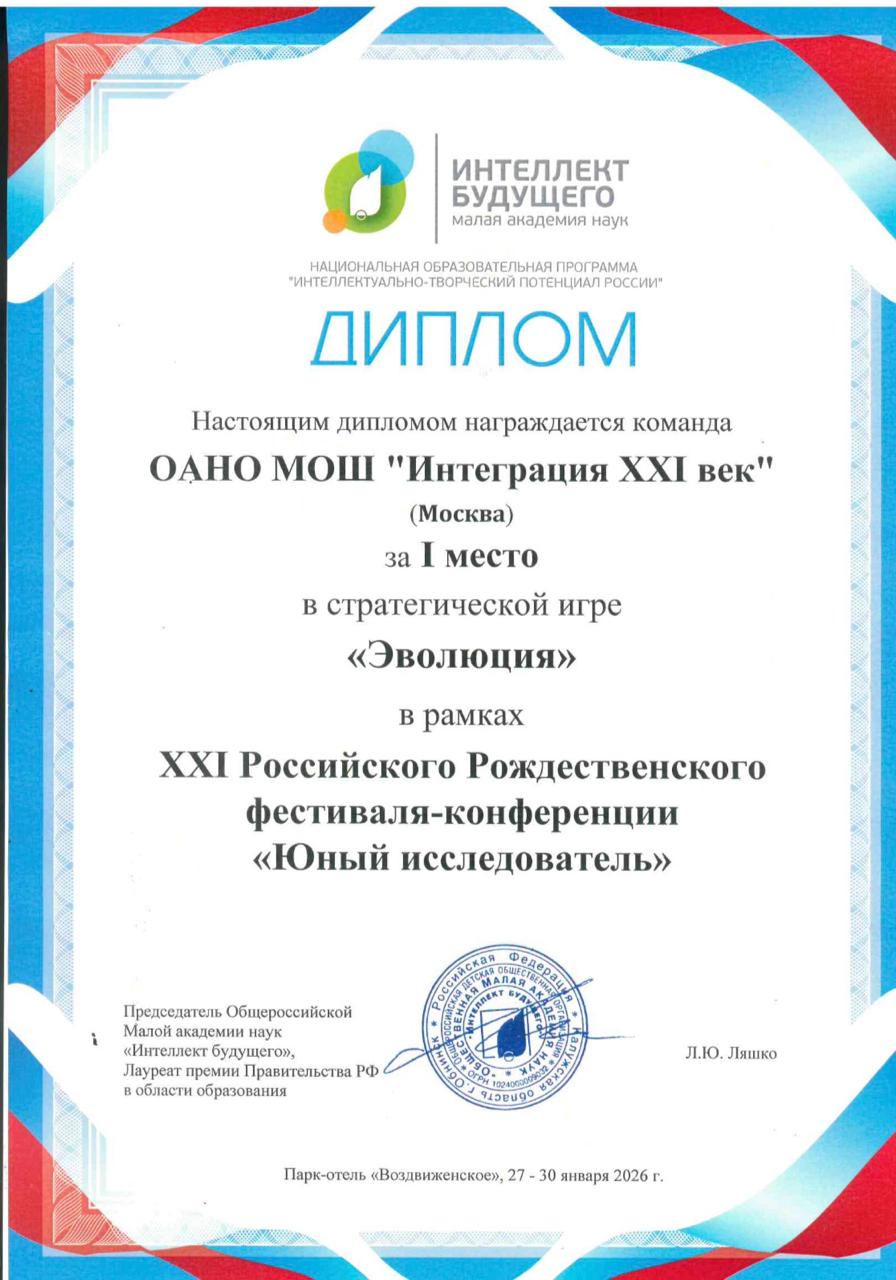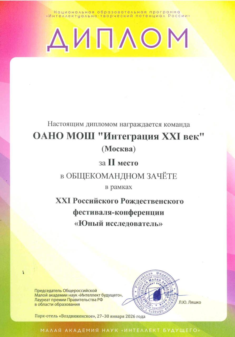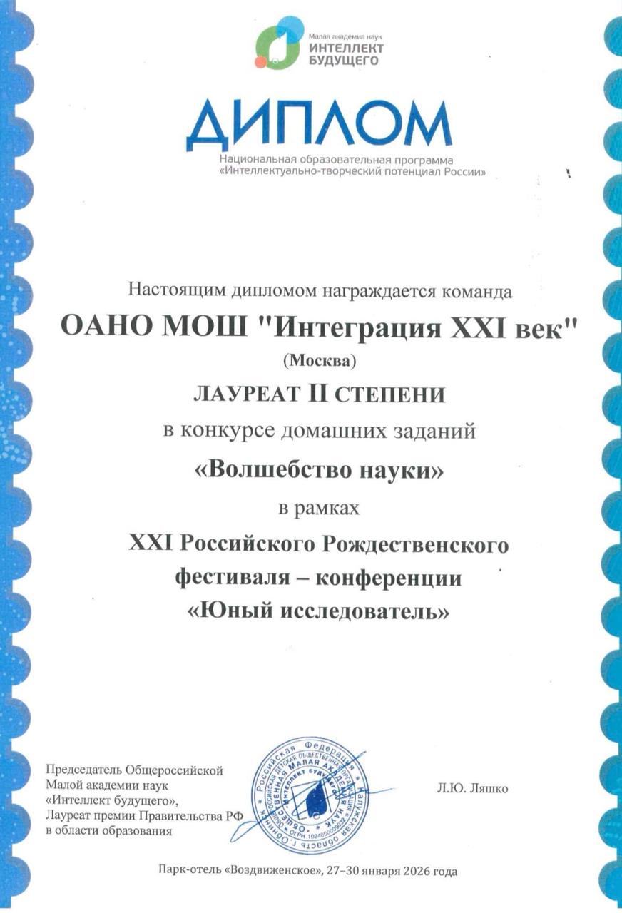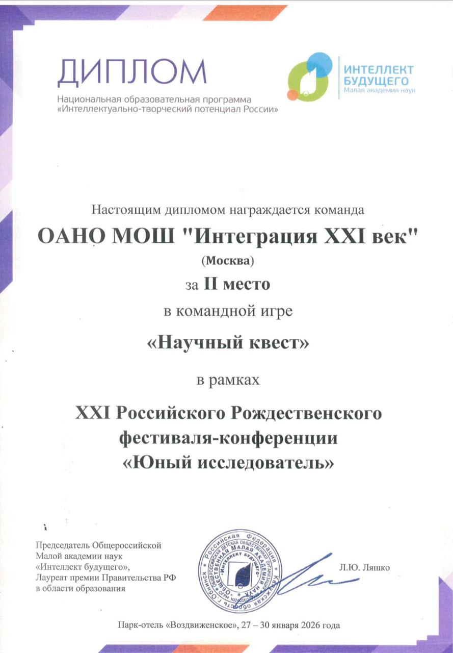 С 27 по 30 января команда ОАНО МОШ «Интеграция XXI век» в составе учащихся 1-5 классов: Александры Леоновой, Михаила Львовского, Льва Богословского, Екатерины Львовской, Алены Сидоренко, Александра Вахрушева и Майкла Котельникова приняли участие во II сессии XXI Российского Рождественского фестиваля-конференции «Юный исследователь».