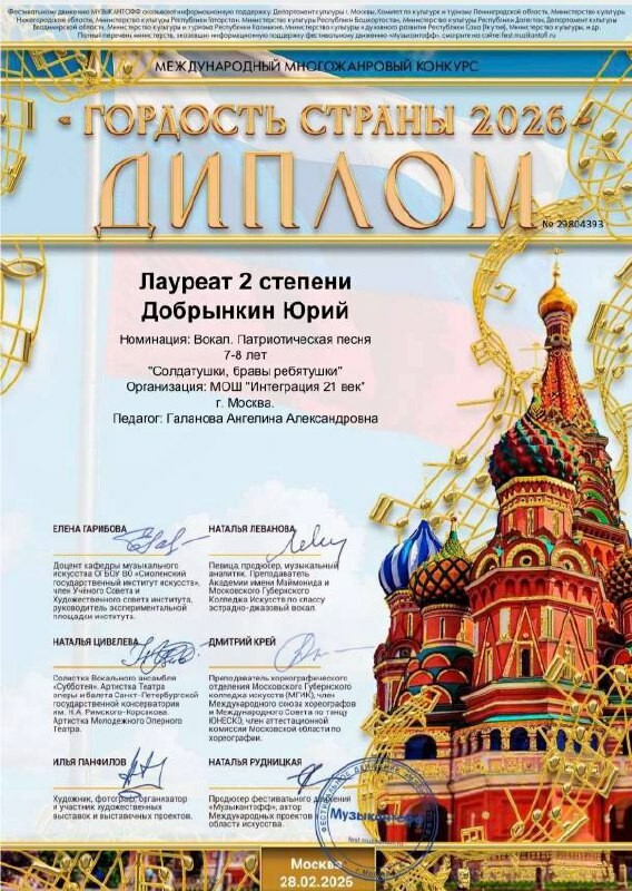 Поздравляем ученика подготовительного класса Добрынкина Юру с участием в творческой номинации патриотической песни, международно конкурса "Гордость страны 2026" и присуждением звания лауреата 2 степени!